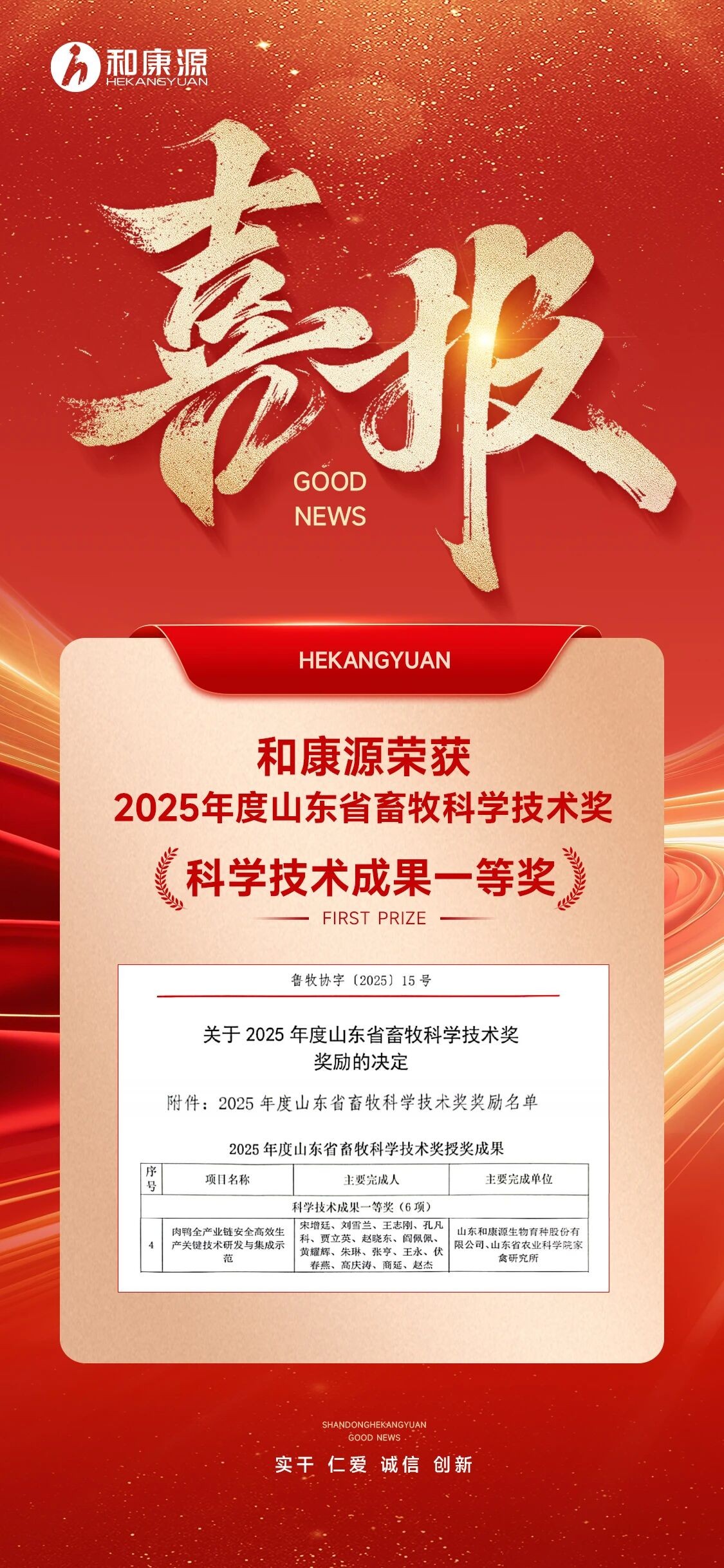 喜報 | 和康源榮獲2025年山東省畜牧科學(xué)技術(shù)一等獎