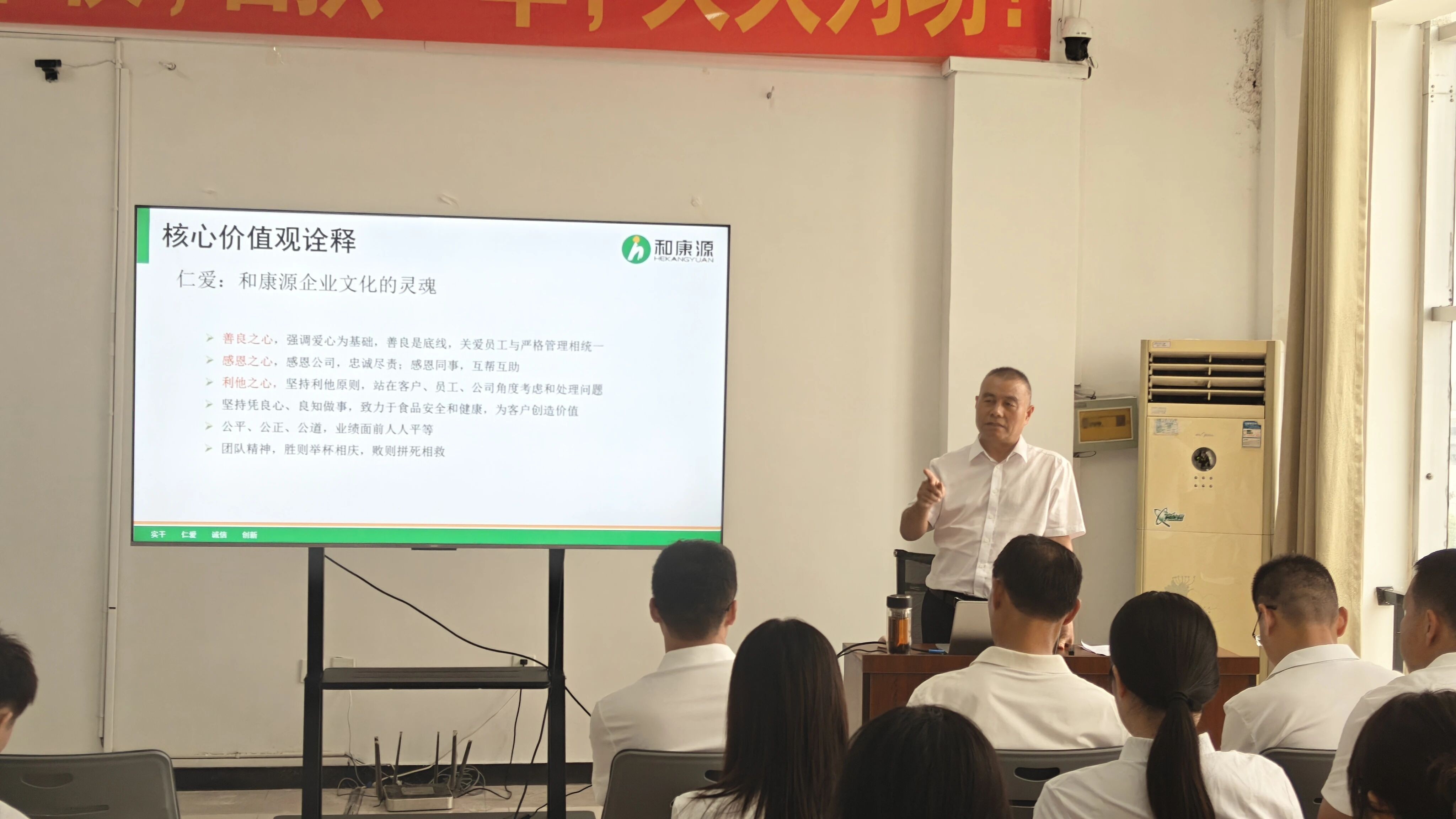 ? ? ? 本次培訓在辦公樓三樓大會議室準時啟幕。蘭陵惠生食品總經(jīng)理郭超致辭拉開序幕,和康源集團董事長孟慶利圍繞企業(yè)文化與發(fā)展歷程展開分享。孟總從和康源創(chuàng)業(yè)初心,到逐步構建全產(chǎn)業(yè)鏈布局,深入淺出闡述了和康源如何在市場競爭中逐步構建起如今的產(chǎn)業(yè)格局,詳細講解了“實干、仁愛、誠信、創(chuàng)新”這一核心價值觀在企業(yè)發(fā)展進程中的具體體現(xiàn)。他談到“馬太效應”強調(diào)愛不是平均主義,而是以奮斗者為本。孟總還強調(diào)蘭陵惠生前三年一定要夯實根基,日拱一卒!這樣才能有助于蘭陵惠生的長期發(fā)展。隨后還詳細的講述了企業(yè)經(jīng)營管理理念和三條“高壓線”,這些文化理念正是企業(yè)實現(xiàn)長期穩(wěn)健發(fā)展的內(nèi)在動力源泉。